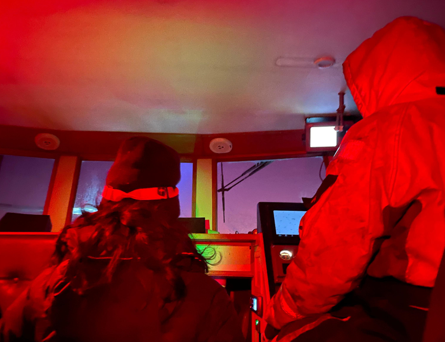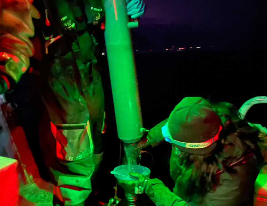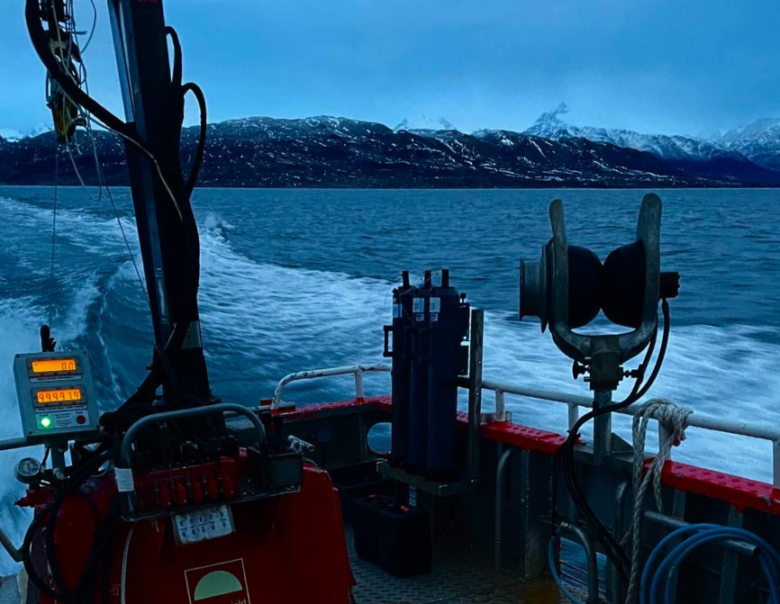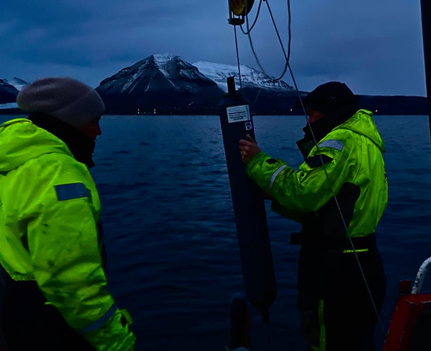 In these photos you see the autumn and winter sample collection from the mid-fjord KB3 site – our weekly monitoring location. The samples are taken with niskin bottles and kept shielded from light so as not to change the in-situ photosynthetic response. Around 60L of water are collected and processed to have three biological replicates at four different temperatures.